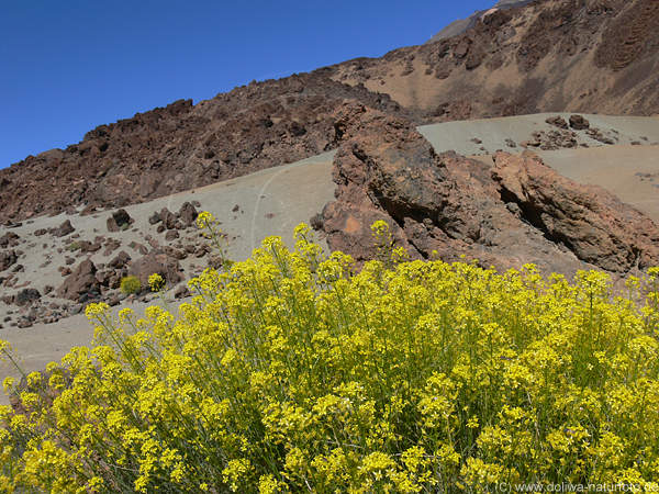 Teneriffa Flora, Planzenwelt auf Bergplateau, gelbe Blumen im Nationalpark unterhalb Pico del Teide, Lavagestein Blick schroffe Felsen vom Teneriffa Bergmassiv