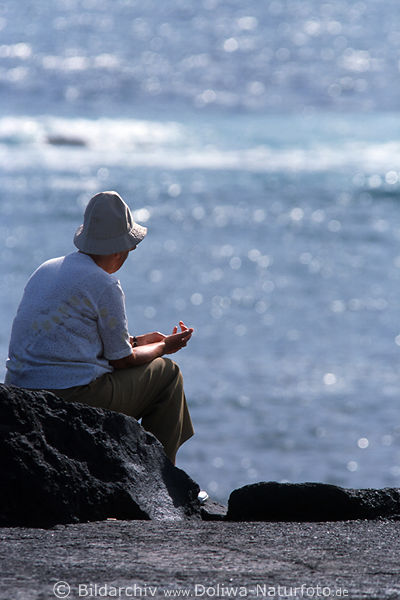 senior, alte Frau im Hut am Fels, felsen, Oma am Meer, glitzer, Entspannung am Wasser, Wellenbrecher von Puerto Cruz Hafen, Kanarische