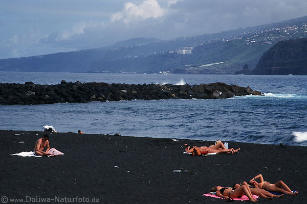 Atlantik, Kanarische Meerküste Seeufer Erholung auf Lavastrand, sonnen, Vulkanstrand, schwarzer Sand, Seeküste, Meerwasser Wellenbrecher