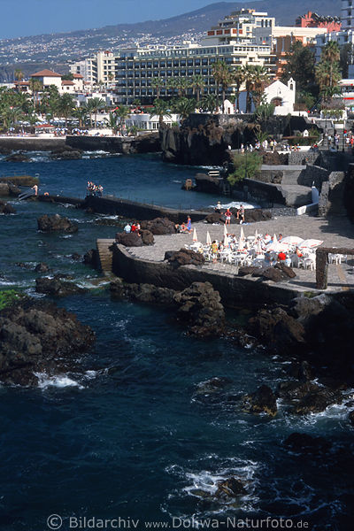 hohe Häuser, Felsen, natureller Wasserbecken, Küste schroffe Felsen mit Stadtbild, Auf Fototour in der City, Urlaubsstadt im grünem Norden der Kanaren, Urlaub Feeling in warmen Metropole der Vulkaninsel am Meer, Reiseangebot Kanaren