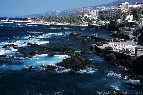 Schwarze Felsen am Zentrum in Ferne: Lago Martianez, Wellen, Hotels Ferienanlage Teneriffa Urlaubsidylle am Meer, Seepromenaden am Seeufer Kanarische Insel City Häuser