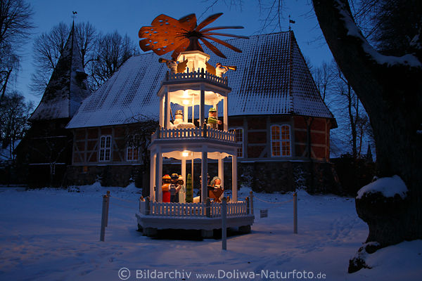 916521. Egestorfer Weihnachtskrippe auf Schnee Winterfoto vor St. Stephanus Kirche, WeihnachtspyramideLüneburger Heidedorf Egestorf Abendstimmung vor alter Kirche mit nebenstehendem Kirchturm, Winterreise in weisse Adventzeit |