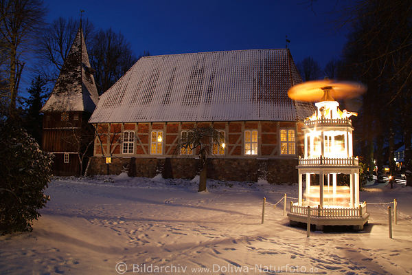 916541. Winter Weihnachten in Egestorf Schneebild: Weihnachtskrippe an Kirche St. Stephanus mit HolzturmEgestorfer Adventzeit Romantik-Abendstimmung auf weissem Kirchplatz Lüneburger Heidedorfes |