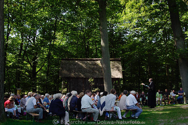 Pastor Ottomar Fricke bei Predig während der Sonntagsmesse, heilige Messe im Grünen, Messebesucher, Gläubiger, Urlauber auf Bänken