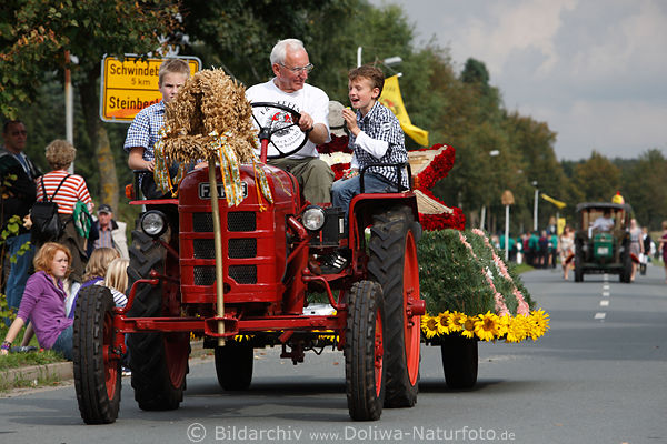 002653 Kinder mit Opa auf rotem Trecker in Feldernteschmuck bild vom Steinbecker Erntefestumzug |