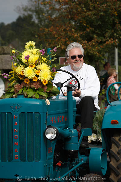 Blauer Trecker geschmückt mit Blumenstrauß Bild, Fahrer Portrait vom Lüneburger Erntefestumzug in Steinbeck
