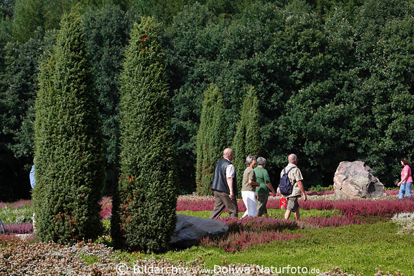 808713 Heidegarten Höpen Foto in Heideblütezeit, Heidebesucher auf Gartenwegen in Urlaub spazierenHeideblütenfest in Schneverdingen Besucher Bild, Heidekrautgewächse zwischen Wacholdern bewundern, Erikakrautarten farbige Blüten auf Gartenrabatten, Lüneburger Heide Attraktion, Menschen in Freizeit bei Heideblüte, Heidekraut im Pflanzengarten Fotografie |
