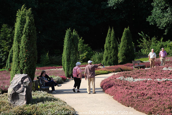 808706 Heidebesucher Bild, Senioren Freizeit auf Gartenwegen in Urlaub spazieren in Heidegarten HöpenSchneverdingen Heideblütenfest Besucher auf Bank & Spazierweg in Bild Heidekrautgewächse Heideblütezeit zwischen Wacholdern bewundern, Erikakraut farbige Blütenarten auf Gartenrabatte in Blüte, Lüneburger Heide Attraktionsbild, Menschen Fotografie im Pflanzengarten |
