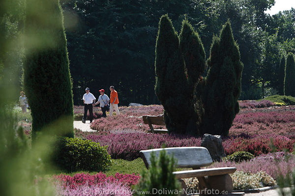 808674 Höpener Garten Bänke Bild in farbigen Heidepflanzen, Heideblütenfest Besucher auf ParkwegenHeidegartenidylle Fotografie Lüneburger Heide in Heideblütezeit, Gartenbänke für Touristen im Park auf Spazierwegen zwischen Gartenrabatten in Wacholder spazieren im Heideurlaub bei Schneverdingen |