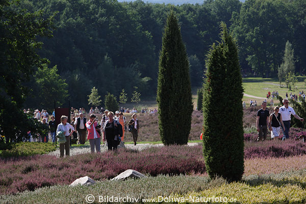808689. Heideblütenfest Touristenströme im Heidegarten Höpen Gartenwege FotosSchneverdingen Besucher von Heideblütezeit zwischen Wacholdern und Heidekrautgewächsen spazieren in Lüneburger Heideurlaub Gartenrabatten |
