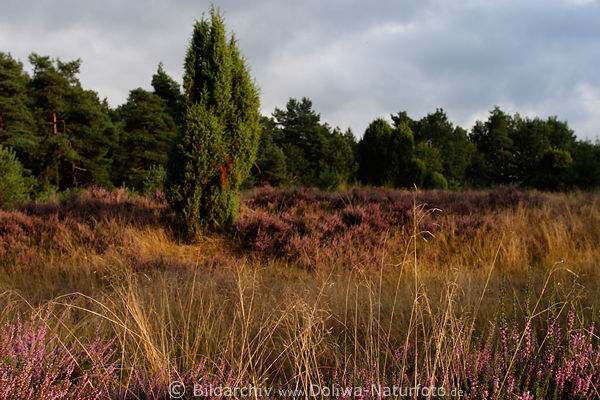 707284. Wacholder Strauchsäule (juniperus communis) am Heidehügel in Heide Blütezeit abends in Fotoblühende Natur Lüneburger Heide, Wacholderstrauch vor Wald in Erikablüte Abendstimmung im Naturschutzgebiet, Besenheide Heidekraut (calluna vulgaris) und Gräser in Abendsonne. Heath blooming image Lower Saxony nature landscape picture, vacation trip view, Germany travel offers tip |