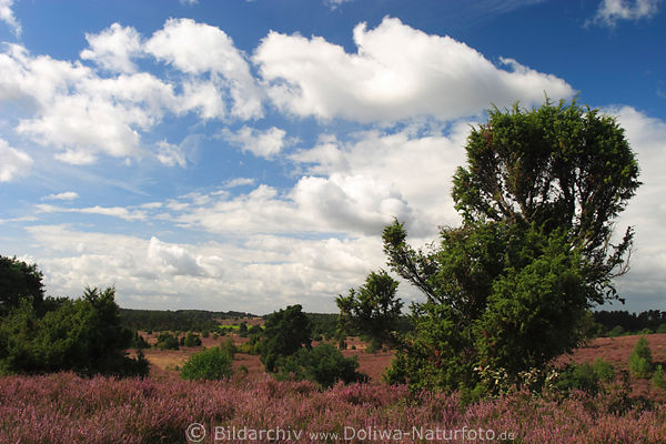 Kiefer Nadelbäume in Natur Heidebild, Heideblüte Naturfotografie. Heath landscape scenic picture from germany Lower Saxony