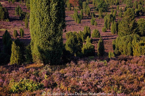 911929 Totengrund-Tal Naturbild: grüne Wacholder Sträucher in blühender Lüneburger Heide