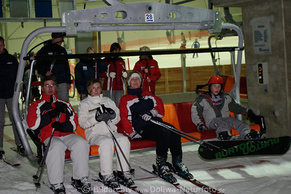 610019. Snow-Dome Skihalle in Bispingen, Skifahrer & Snowboarder nach Sessellift Einstieg in Fahrt zur BergstationSchihalle in Lüneburger Heide, Reiseattraktion für Skibegeisterte & Winterspass für Sommermonate, Skifahrer & Snowboarder Winterurlaub-Bild |