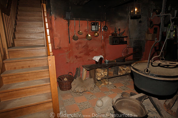 911885. Kochtopf Küchenwand mit Haushalt-Werkzeug Alltagsgeräte Foto vom Wilseder Heidemuseum |
