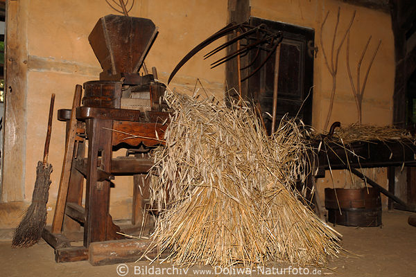 911900 Getreide, Ernte-Werkzeug Foto: Heidjer-Mühle, Sense im Dat Ole Hus Heidemuseum in WilsedeAlles für Gertreideernte um Jahrhundertwende in Lüneburger Heidefotografie |
