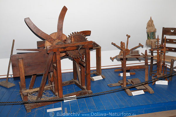 Wollkratzbock, Spinnrad, Hecheln, alte Maschinen Exponate in Bild wie auch Schwingbock, Schwingbrett sind zu sehen im Dat Ole Hus - dem alten Haus der “Heidjer” im Urlaubsort-Museum inmitten Naturschutzgebiet Lüneburger Heide Fotografie