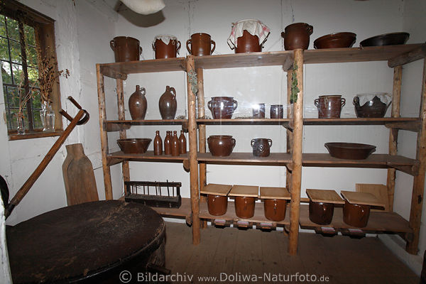 Heidjer-Töpfe, Flaschen, Tonware zum Aufbewahren von Speisen in Wilseder Heidemuseum Foto