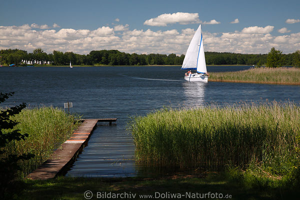 Masurens schöne Wasserlandschaft Reise, Seehorizonte über Seebrücke im blauen Wasser, Ostpreussen Urlaub masurische Natur Seeblicke von Halbinsel Mały Ostrów auf Erholunszentrum Kraśnik unter Schönwetterwolken Reisebilder urige Natur Bootausflug Ferienidylle Wasserliebhaber