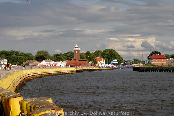 Touristen auf Seebrücke, Wolkenstimmung über Hafenstadt am Seewasser, Fischereihafen am Meer. Urlaubsort nah Rügenwalde (Darłowo) in Reisebild, Ostseereise zur Mündung der Wipper, Hinterpommern Ausflug ost-nördlich von Köslin (Koszalin) Reiselust Polen