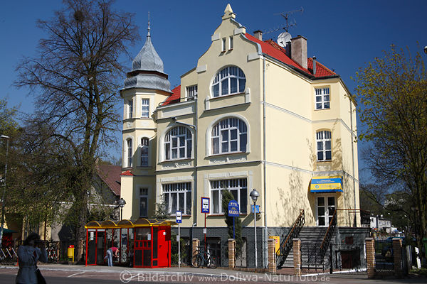 polnischer Erholungsort Kurort am Meer mit Seepromenade, vielbesuchter Urlaubsziel hinter Swinemünde an Ostsee in Reisefotografie macht sich von Jahr zu Jahr hübscher. Villa im Stadtkern beherbergt ein Reisebüro Natura “Amadea” mit Reiseangebot Unterkünfte für Touristen. Immobilie im Stadtzentrum