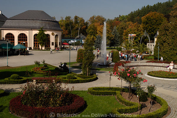 kuracjusze i turyści na placu parkowym przed Pijalnia Wód Mineralnych, Sudety urlop fotografia, przewodnik turystyczny widok w fotoarchivum fotogaleria.