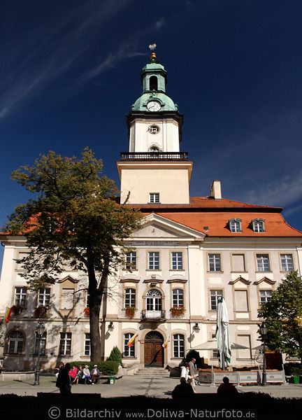Touristen Urlauber auf Bänken in Sonnenschein Urlaub geniessen in Hirschberg (Jelenia Góra), Schlesien Bildreise in Reisefoto aus Reisestadt am Riesengebirge (Karkonosze). Markt in Stadtzentrum. Rathaus aktueller Sitz der Stadtverwaltung. Fochformat