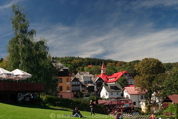 (Karkonosze) Touristen Urlauber auf Wiese, Luftkurort Erholung, Sport Treffpunkt für Besucher, Skigebiet Urlaubsort Blick vom Hang in Reisefotografie. Karpacz widok na miasto ze stoku narciarskiego, Sudety urlop, przewodnik turystyczny fotoarchivum galeria
