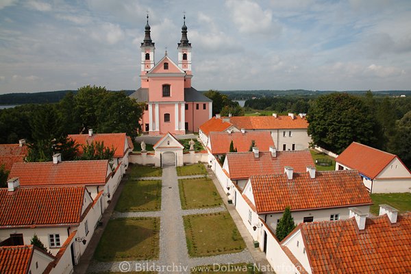 Kloster Wigry Gebäudekomplex Rotdächer Fotoansicht auf Halbinsel Wigry in Wasserlandschaft, Besucher Attraktion Fotografie Postermotiv. Rote “Eremy” um den Hof (ehem. Häuschen der Mönche) dienen heute als Hotel für Urlauber im Polens Nordosten.