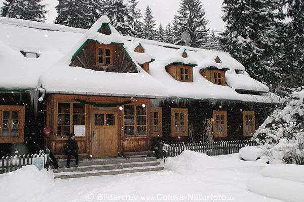 ganz nah an Grenze zur Slowakei, Polen Reise in Winter, Hütte traditioneller Holzbau in Wälder der Bergwelt, Unterschlupf für Wanderer im Winterbild, Holzhütte Winterfoto aus Bergen nah Zakopane. Wanderer Unterkunft