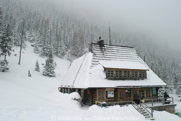 in Natur von Nationalpark der Karpaten, Zakopane Umgebung, Polen Tourismus in Bergen, traditionelle Hütte im Holzbaustil in wilder Bergwelt Winterbild in Nebel. Schronisko w Dolinie Bystrej zima fotografia z Tatr polskich