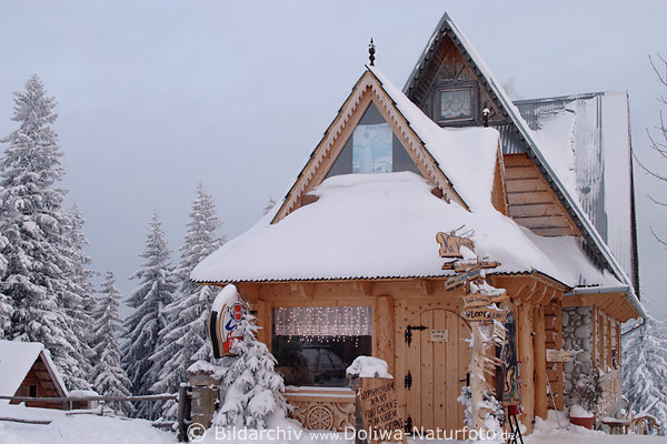 Winterbild aus Zakopane - Kneipe auf Gubałówka in typischer Holzbauweise in Schnee & Winter, Zakopanestil, Urlaubsort in Hohe Tatra, Holzhaus in verschneiten Fichten, Reiseregion in Bergen, Bergstadt in Polen, travel photo from Poland