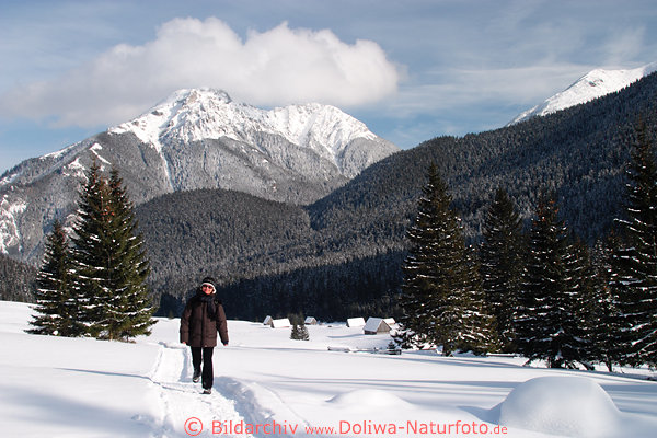 Holzhütten in Sonnenschein, Sennhütte Bild, Schutzhütte, Senne, Schweizerhäuschen Chalet, zeitweise genutzt zu Weidezwecken für Schafe, Touristin wandern zwischen Fichten im Schnee vor Kominiarski Wierch 1829 m Gipfel (Kominy Tylkowe) schneebedeckt, darunter Wielki Kopieniec bewaldet Nationalpark Hohe Tatra, Zakopane Urlaub Bergregion: Dolina Chochołowska Bergwelt in Winter Fotografie Berge beliebtes Ausflugsziel