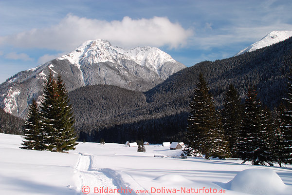 Bergwelt Naturbild vom Ski-Wanderweg mit Bergblick auf Kominy Tylkowe Gipfel mit Kominiarski Wierch (1829 m) über Fichtenwald Bäume und schneebedeckte Bergholzhütten, Sennhütten. Zakopane Bergregion Urlaubausflug in Winterzeit Fotografie