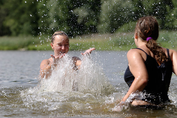 planschen & plätschern im Wasser, Spass in Wasserspritzer, baden & toben im Seewasser, junge Frau, Mädchen in Ferien bei Wasserspass im Sommer, Ferienzeit & Freizeit in Menschen Fotografien, Sommerzeit