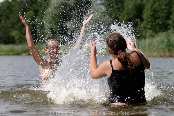 baden toben im Seewasser, junge Frau, Mädchen in Ferien bei Wasserspass im Sommer, Ferienzeit Freizeit in Menschen Fotografie, Sommerzeit, pair girls splashes on water at lake in summer time