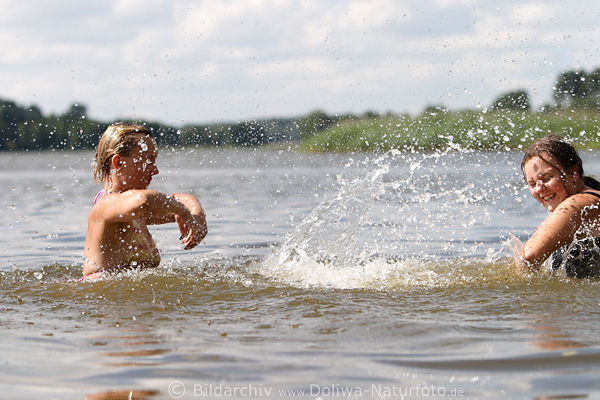 Wasserspritzer Spass beim Baden & Urlaub am See, Frau & Mädchen, Kind in Ferien bei Wasserspass im Sommer, Ferienzeit & Freizeit in Menschen Fotografien, Sommerzeit, pair girls splashes on water at lake in summer time