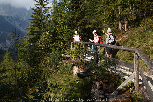 Freizeit Naturausflug Wanderporträt grüner Wälder in Berglandschaft mit Blick auf felsiges Bergmassiv. Natur erwandern für Gesundheit