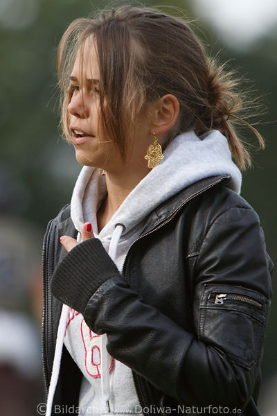 Blondine in Lederjacke Frauengesicht, Menschen Freizeit portrait.