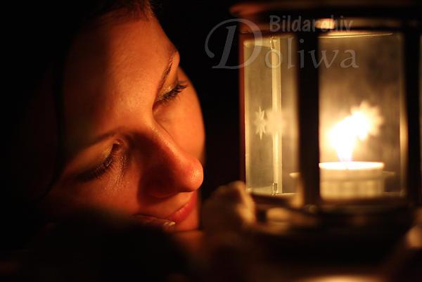 hübsches Mädel ins Lampenlicht, Frauengesicht Fotografie, Nahfoto in warmer Lichtstimmung eine Abendlampe