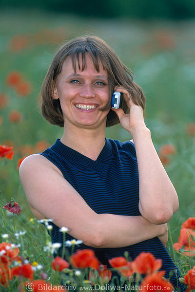 Mädchen, lachend, Freude, fröhlich, Mohn, Papaver rhoeas, Blumenfeld, blühend, Blütezeit, rote Blüten, rot, Mädel, Portrait, Porträt, Menschen, phone, girl, people