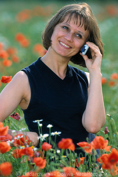 handy, telefon, gespräch, Mädchen, lachend, freude, frühlich, mohn, Papaver rhoeas, blumenfeld, bluehend, blüte zeit, rote blüten, rot, magd, Mädel, portrait, porträt, menschen, phone, girl, people