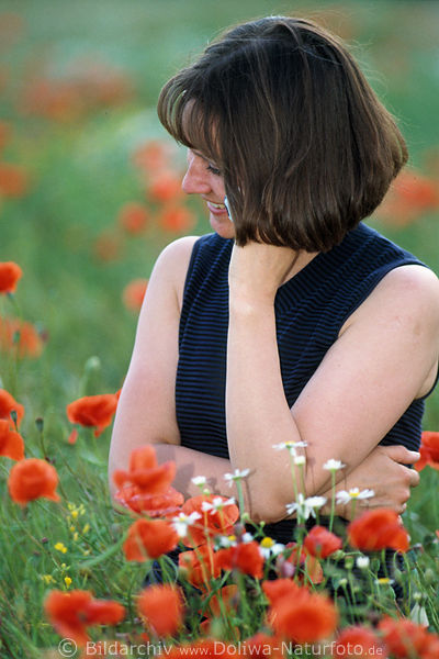 Menschen Porträt im roten Wildblumenfeld, romantischer Ausflug in Natur, Mädchen fröhlich lachend im Mohnblumenfeld, Mädel beim Gespräch per Telefon