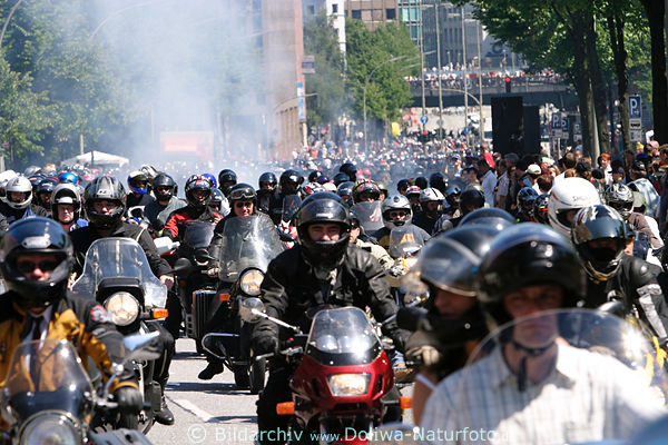 Harleyfahrer Foto, Harley Days Fotografie, dicke Luft & Scheinwerfer Lichter, Motorrad Konvoi, Straßenfest in Lederlook