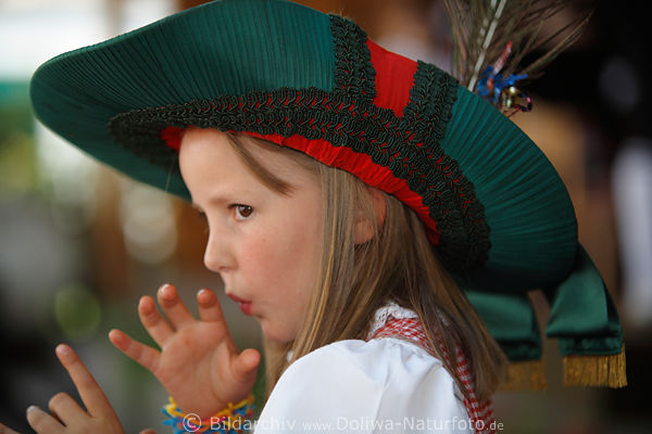 Im Dorf der “Kastelruther Spatzen” liegt das Musizieren bereits im Blut der jüngsten Musikfans, Musik spielen beim Kirchtag, Porträt im Grünhut mit Feder neben Bühne, Publikum der Musikkapelle