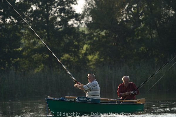 bei Angeln, Freunde Paar auf See im Boot am Wasser, Buwelnosee, Martinshagener See in Masuren, Fisch-Touristen