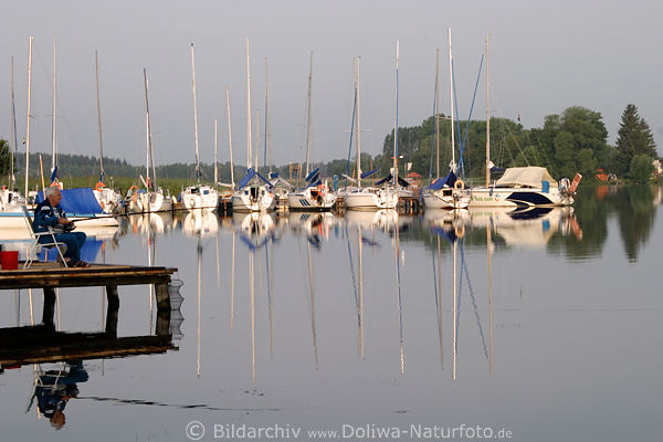 Senior, Fischer mit Angel fliegenfischen, Erholung vor Bootsanleger mit Segelbooten in Seewasser gespiegelt, Anlegerstelle Boote Spiegelung im Boczne See in Masuren, Masurische Seenplatte Urlaub mit Angel