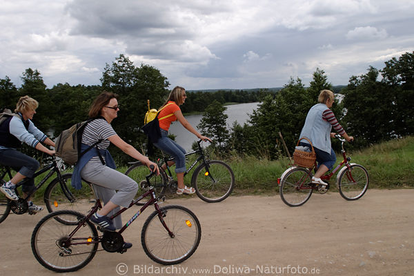 (Ublik Wielki, gmina Milki, Gizycko, Mazury) Naturausflug auf Landweg, Radtour in Masuren Seenplatte Landschaft, Mädels unterwegs mit Fahrrad, Freizeit Radfahrer in Ostpreussen Urlaubbild
