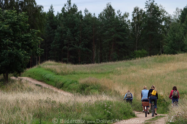 Mädels unterwegs in Masuren, mit Fahrrad auf Landweg in Ostpreussen Landschaftbild, Rucksacktouristen mit Zweirad radfahren entlang Wiesen