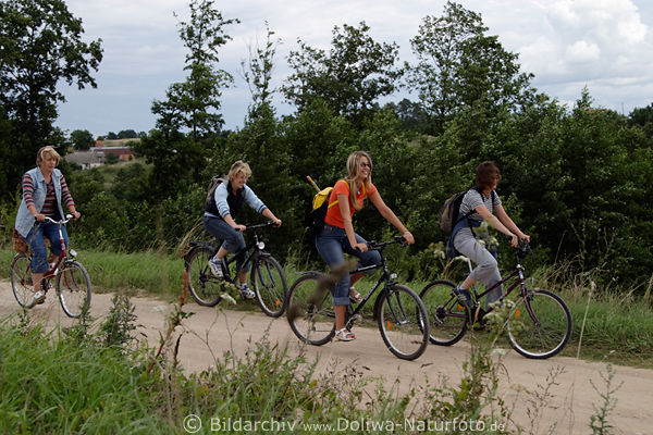 Frauquartett unterwegs mit Fahrrad auf Landweg in Ostpreussen Landschaftbild bei Wyszowate, Zweiradausflug entlang Wiesen, Rucksacktouristen mit Fahrräder, Bicycle girls in Masuria landscape photo, mazury bicycle-tour in Masuria